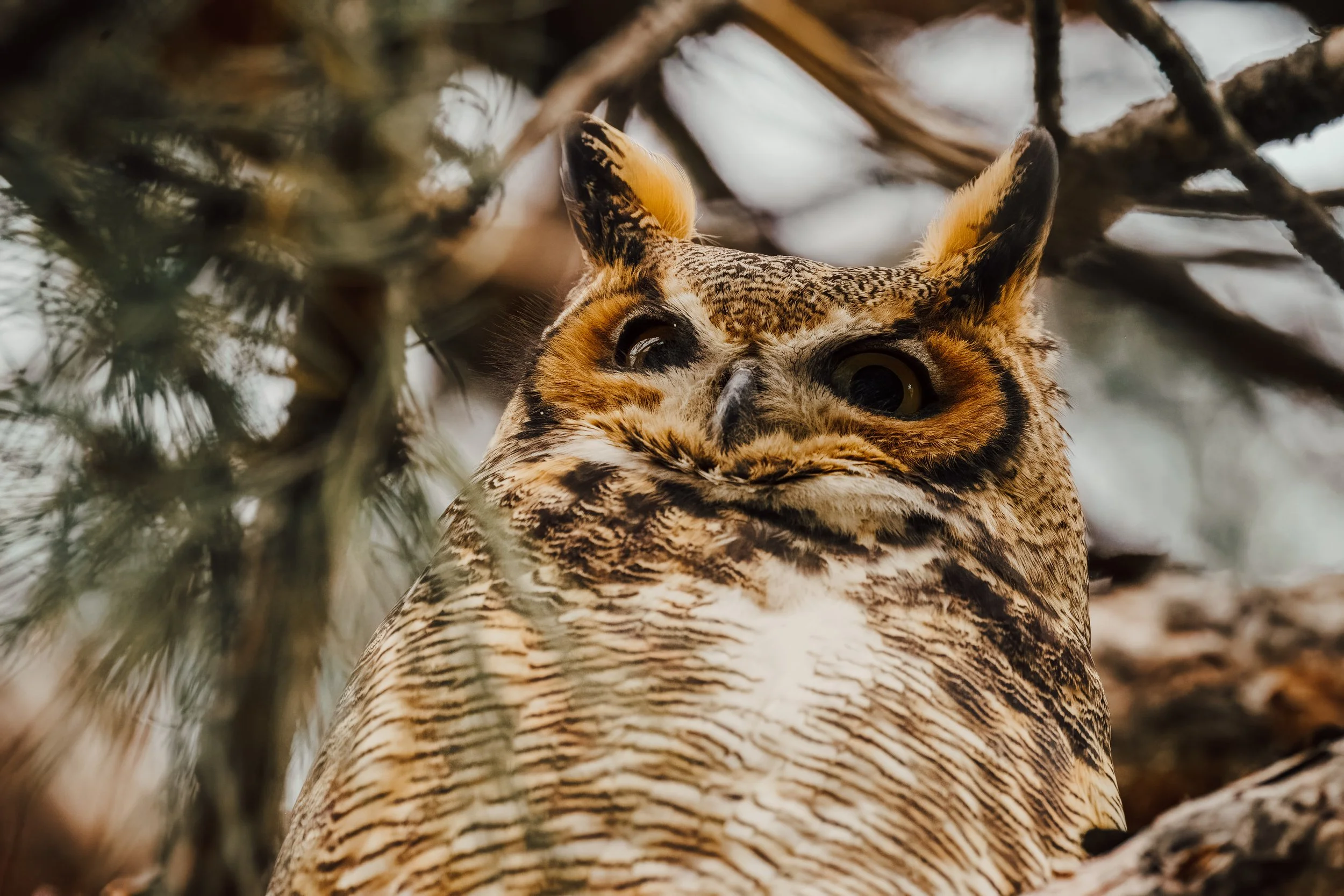 This Great Horned Owl has lived in my neighborhood for about a year. I can hear it hooting with its friend on occasion. One, very lucky afternoon, I heard three blue-jays going crazy. I grabbed the camera, thinking I was about to shoot some jays, but to my astonishment, they were all squawking at this owl, just 15 feet above my head, right in my backyard. I noticed the other birds flew away when I approached, and the owl seemed to find my presence more preferable to the annoying birds, so they let me get as close as I could and take photos for well over an hour. I would be lying if I said I didn’t do a happy dance in the living room once I downloaded this footage.